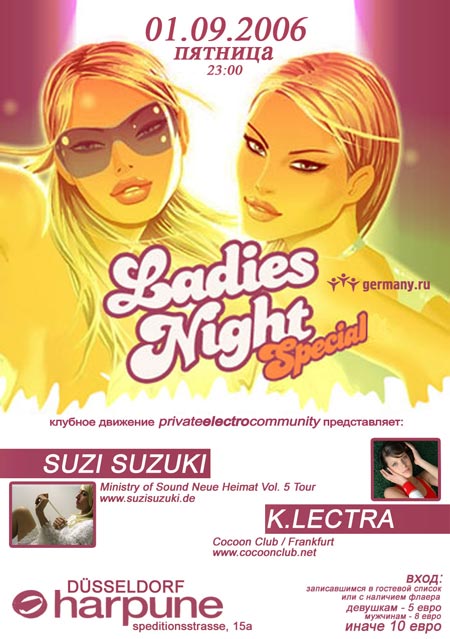 Nun schon zum dritten ist das P.E.C. Project in der Harpune, einem der besten und angesagtesten Club Deutschlands. Auch nun soll der kleine Hafenclub aus allen Nähten platzen. Viele von Ihnen wisssen bereits , dass unser Musikstil und die unbeschreibliche Atmosphere uns von den meisten russischen Diskotheken abhebt, andere werden es am eigenen Leib erfahren, und nicht mehr missen wollen. "LADIES NIGHT SPECIAL" lautet das Motto des Abends, dafür wurden zwei weibliche DJ-Superstars: "K.electra" und "SuziSuzuki" eingeladen, die mit ihren treibenden Sounds schon die Bekanntesten Clubs Europas wei MINISTRY of SOUND, COCOON, TRIBEHOUSE, ZUHOUSE zum rocken brachten.