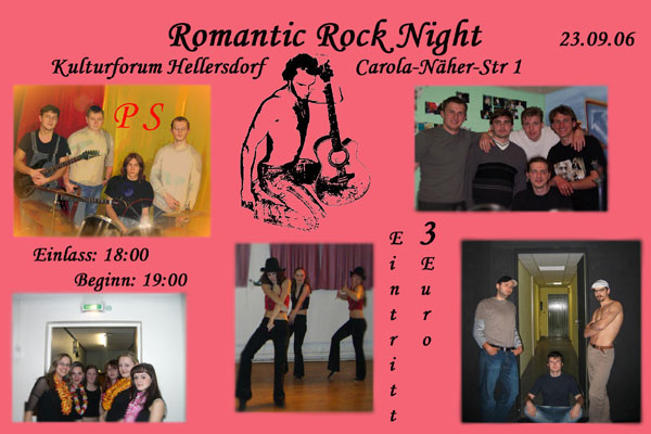 Во второй части нашего вечера можно будет расслабиться и потанцевать (это совсем не означает, что танцевать во время концертов запрещается). Будет устроенна дискотека, а те, кто уже подустанет от музыки и концертов, смогут выйти в сад, где можно будет просто посидеть или провести время за интересным разговором присвете факелов. Единственное условие для этого v это хорошая погода, над чем организаторы, к сожалению, не властны. Намного больше мы не хотим открывать. Если Вас заинтересовал наш фестиваль и Вы хотите больше информации, то заходите на www.tundtinberlin.de. Или просто приходите 23.09.2006 в 18.00 по адресу Carola-Näher-Str.1 и увидьте всё своими глазами. Мы ждём Вас всех!