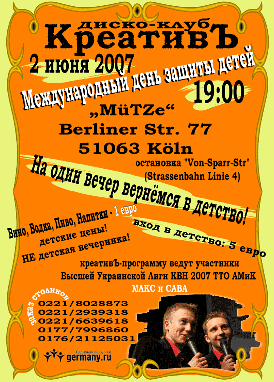 Internationaler Kindertag in Disco-Club "Kreativ" Internationaler Kindertag in Disco-Club "Kreativ"- alle Getränke 1 euro! Russische Disco. 3829 02 Jun 2007 (Sam) 19:00 Köln 51063, MüTZe, Berlinerstr. 77 вход в детство: 5 евро'MüTZe' Berliner Str. 77 51063 Kölnостановка "Von-Sparr-Str"(Strassenbahn Linie 4)заказ столиков0221/80288730221/29393180221/66396180177/79968600176/21125031