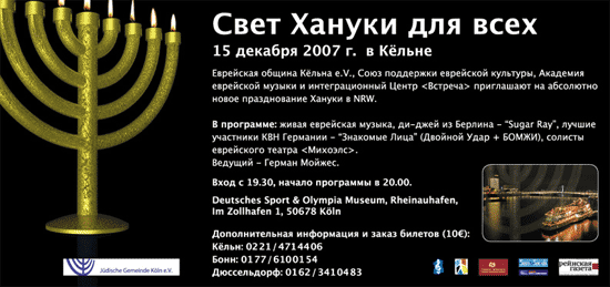 Еврейская община Кельна e.V. сердечно приглашает Вас на праздник Ханука!