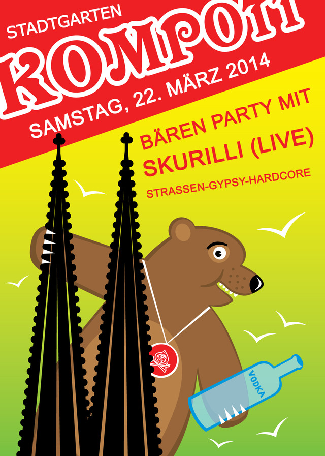 Der erste Frühlingsmonat ist in Russland traditionell ein Monat der Überraschungen. Die Bären, lästige Miliz mit Promille-Messgeräten erwachen aus dem Winterschlaf. Auf einmal taut und taucht alles auf, was monatelang unter Schnee, Eis und Dunkelheit des Winters verborgen war: Die Löcher im Asphalt (vom Eis gesprengt) und im Landesbudget (von der Winterolympiade gesprengt), Müll auf der Strasse, aber auch die Betrunkenen, und die nackten weißen Körperteile der russischen Männer. Und manchmal tauchen auch grandiose Straßenbands auf. So wie Skurilli - die Band ist zwar ein Deutsches Erzeugnis, würde aber auch in St.Petersburg eine gute Figur machen. Die Guerilla-Kapelle aus Köln hat sich einen Namen gemacht mit Auftritten in engen Straßenbahnen, zugigen U-Bahnstationen und verregneten Parks. Ihr Sound, steppt zwischen Balkan und Punkrock, Schlager und Folk, dazu steppt der bandeigene Bär. Neun, vielleicht auch zehn oder zwölf Jungs werden euch eine Portion von Gossen-Folklore und Speed-Polka verpassen, bei der euch Hören und Sehen vergeht. Wach auf und weck den Bären Dir. Davor und danach beste Sounds zum Auftauen vom immer wachen Kompott-DJ-Kollektiv.
