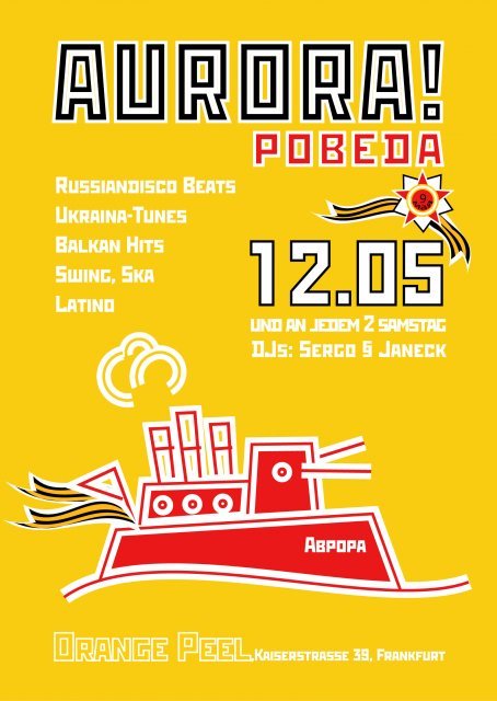 Im Mai vor 67 Jahren wurde die Nazi-Herrschaft beendet. In Russland feiert man jährlich am 9. Mai den "Tag des Sieges" mit einer pompösen Militärparade. In Deutschland wird der Jahrestag des Kriegsendes, der 8. Mai kaum wahrgenommen. Die Marschmusik vom Roten Platz wird aber bei der nächsten Aurora-Party auch NICHT gespielt. An das wichtige Ereignis in der Weltgeschichte erinnern wir wie Immer mit Tanzen, Hüpfen, Klatschen und Mitsingen. Ein ehemaliger Trompeter eines sibirischen Militärorchesters wollte uns zwar zu diesem Anlas seine ganze Kapelle aus Russland vermitteln, nun waren aber seine Regimentskameraden bei den den Veranstaltungen in Russland an den Feiertagen zu beschäftigt. So wird nur er und seine Trompete unser äußerst tanzbares Frühlingsprogramm in "Aurora-Party-Style" unterstützen und allen Kriegen den Abschiedsmarsch mit viel Groove blasen.
