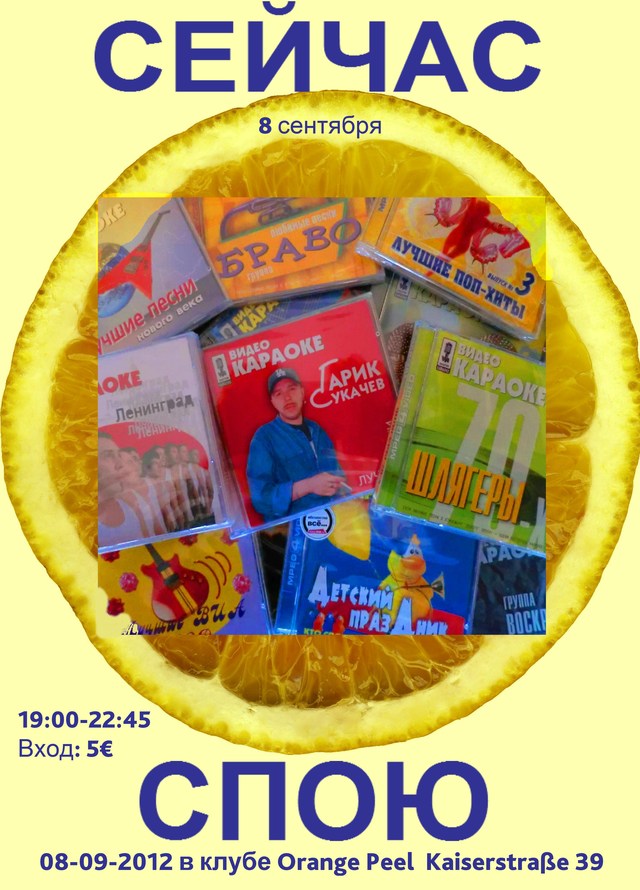 Окажитесь в Апельсиновой Шкуре! В субботу 8 сентября вы сможете спеть свои любимые песни на сцене клуба Orange Peel. После оглушительного успеха мероприятия прошлой весной (кто был – тот знает!) и по многочисленным просьбам мы проведем очередной вечер русско-украинского караоке. Вас ожидают умопомрачительные призы: Первое место - бутылка водки. Второе и третье - DVD с русскими фильмами. Вход - 5€, В субботу 8 сентября с 19:00 до 22:45 и сразу после Караоке, с 23:00 - Аврора-Парти до утра! http://events.germany.ru/1005622216 специальная цена на обе парти (Караоке & Аврора) - 10 €!