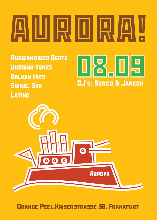 Всеми любимые мотивы из классических комедий и вечно свежие и обваражительно стильные ретро-шлягеры флиртуют с электро-свингом, гуцульские и клейзмерские мелодии с карибскими ритмами Ска, Рэгги и конечно Латино. А хиты из фильмов Кустурицы и прочая балканщина мирно уживается с хитами из репертуара Берлинского Russendisko и это, согласитесь, удивительно приятно когда испанцы, итальянцы, чехи, поляки, сербы, англичане, шведы, ну и конечно немцы отплясывают под с детства знакомые нам песенки и новинки альтернативной музыки с некогда 1/6 суши! Очень приятно также, что от раза к разу к нам на вечер презжает все больше «авто-караванов» из Мангейма, Вюрцбурга или Штуттгарта, а это значит, что атмосфера на Аврора-Парти стóит сотни киллометров в пути!