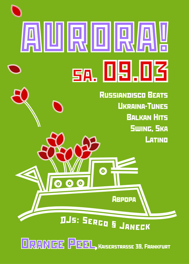 Дорогие друзья, давайте отпразднуем этот прекрасный и любимый праздник в "своей" компании в центре Франкфурта! Наших милых дам в честь Международного женского дня мы будем приветствовать шампанским! А хиты в стиле Аврора-Парти наполнят этот вечер весельем и хорошим настроением, как и положенно на 8-e Марта.