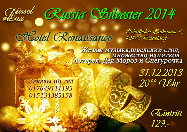 Дорогие друзья! Волшебная Новогодняя Ночь в шикарном Отеле "Renaissance" c Düssel-Lux. Искрометная развлекательная программа, живая музыка - Группа Максимум (Frankfurt a.M). Поздравления и супер-призы от Деда Мороза и Снегурочки! Новогодняя лотерея! Шведский стол, множество алкогольных и безалкогольных напитков,десерт ...!