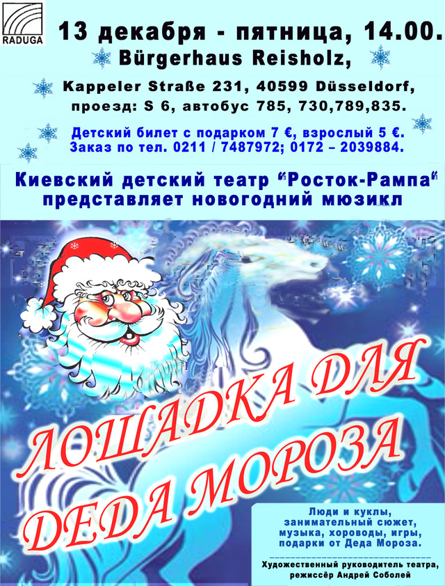 Новогоднее представление "Лошадка для Деда Мороза", артисты и куклы, песни и хороводы, сюрпризы и подарки. Заказ билетов : 0211-7487972; 0172-2039884.