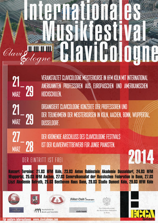 Приглашаем Вас на концерт фестиваля CLAVICOLOGNE в консульство РФ в Бонне. Один из концертов нового музыкального проекта CLAVICOLOGNE, мы с удовольствием приглашаем Вас провести на территории консульства российской федерации в городе Бонн, Германия. Многие участники фестиваля, выступления которых вы услышите на вечере, представляют различные регионы России. Вы услышите блистательную игру не только молодых и талантливых исполнителей, но и тех мастеров фортепианной школы, которые воспитывают новое поколение музыкантов: Аркадий Ценципер, Юрий Диденко, Василий Щербаков, Никита Фитенко и многие другие.