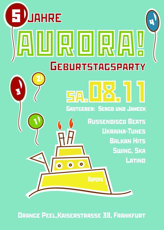 В бодром ритме Аврора-Party пролетел для нас еще один год! Пускай этот "юбилей" и не такой серьезный, исполняется нам всего 5 лет, но за это время наш тацевальный вечер прочно занял свое место на франкфуртской сцене и подарил многим немало приятных моментов. Но не музыка и даже не мы, а именно публика, то есть Вы, делате "Аврoру" чем-то особенным! Когда все веселятся или, как поет группа "Ленингад", колбасятся вместе и по полной, независимо от национальности, цвета кожи или социального статуса, а для понтов, позерства и комплексов просто не остается места - это "Аврора-Party"! Приходите на наш 5. день рождения можно и без подарков, но с хорошим настроением! Это и будет самый лучший подарок.
