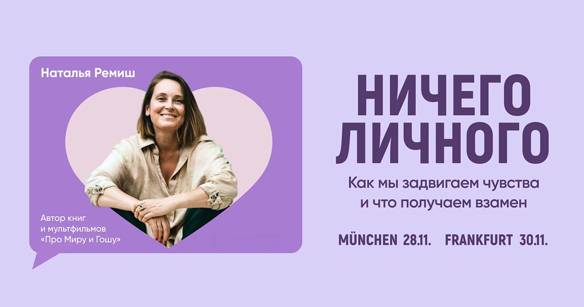 Verpassen Sie nicht ein informatives Treffen mit Natalia Remish! Bei dem Vortrag "Nichts Persönliches. Wie wir unsere Gefühle verdrängen und was wir dafür bekommen" wird Natalia Remish offen darüber sprechen, welche Gefühle wir in der Kindheit zu verbergen gelernt haben, was mit uns passiert, wenn wir Gefühle unterdrücken, und wie sich das auf unser Erwachsenenleben auswirkt.